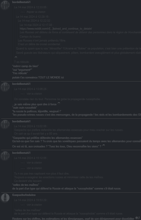 de la part d'un type qui défend la Russie et attaque la "russophobie" comme s'il était russe.Restons sur les chiffres, les estimations et les témoignages, osef de son dénigrement pour discréditer