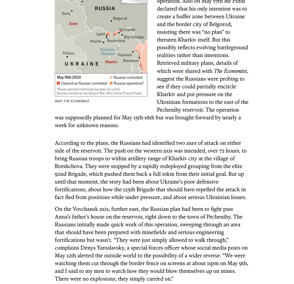 Retrieved military plans, details of which were shared with The Economist, suggest the Russians were probing to see if they could partially encircle Kharkiv and put pressure on the Ukrainian formations to the east of the Pechenihy reservoir. The operation was supposedly planned for May 15th-16th but was brought forward by nearly a week for unknown reasons.