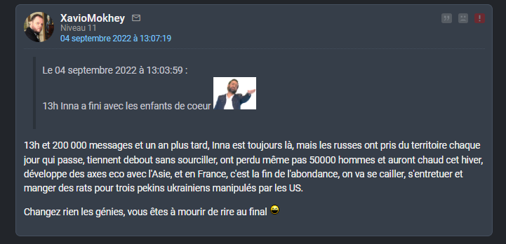 > > '''C'est fou, ce mec qui se trompe sur tout depuis bientôt 1 an continue d'avoir ses groupies alors qu'il a désormais la même crédibilité que Xavier Moreau.