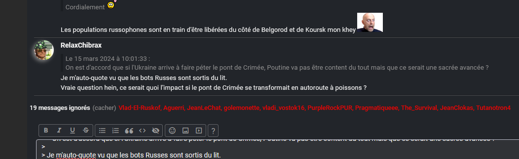 On est d'accord que si l'Ukraine arrive à faire péter le pont de Crimée, Poutine va pas être content du tout mais que ce serait une sacrée avancée ?Je m'auto-quote vu que les bots Russes sont sortis du lit.