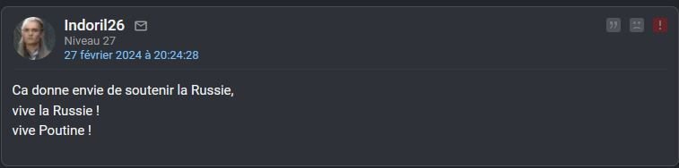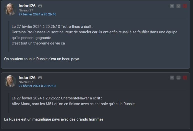 Des mecs qui partent au quart de tour quand tu dis un mot trop négatif sur la Russie mais qui ensuite essaient de te faire gober qu'ils ne sont pas des bots, juste des "patriotes anti-américains"Ca marche plus cet axe de défense depuis les dérives d'ass-lineau