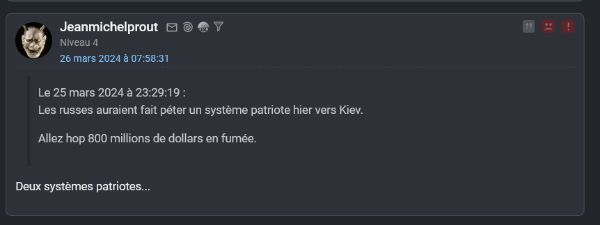 > 4 postes de bouclage sur mes modestes propos mais y'a pas 1 cerveau sur 4 pour remarquer que la ballasitique russe rentre comme du beurre dans défense ukrainienne depuis 24/48 heures