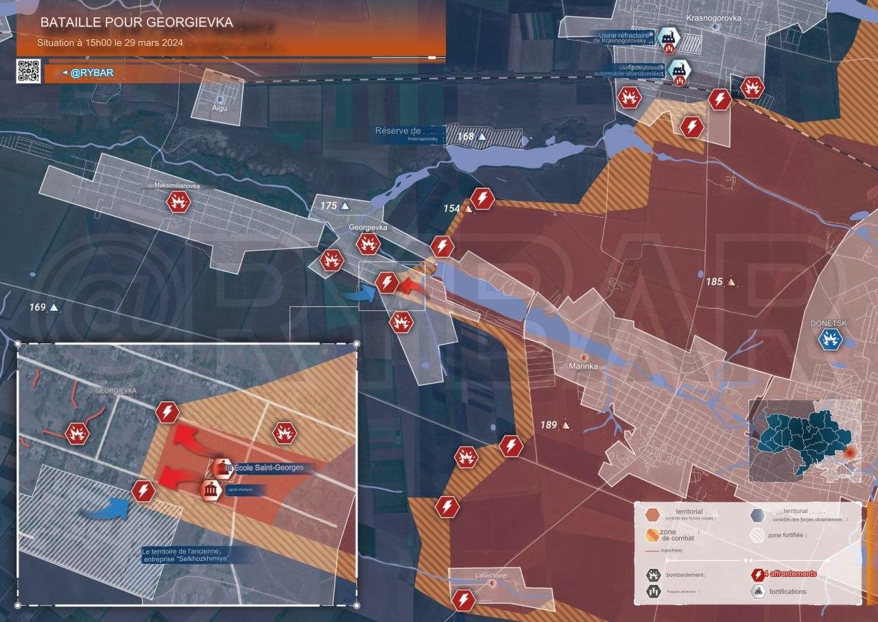 (tentative de traduction de la carte avec google traduction)Direction Donetsk : Les forces armées russes avancent dans le centre de Georgievka Les unités russes progressent à Georgiyivka le long des rues Lenina et Gagarin vers la périphérie ouest de la colonie. Selon les derniers rapports, les forces armées russes ont pris le contrôle total des bâtiments de l'école et du jardin d'enfants, où les forces ukrainiennes avaient pris position pendant plusieurs semaines. L'armée Ukrainienne s'est replié sur le territoire de l'ancienne exploitation agricole "Selkhozkhimiya", où subsistent quelques bâtiments susceptibles d'être défendus. À la périphérie ouest, l'AFU a créé un réseau de tranchées pour le transport de la main-d'œuvre. Au nord de la localité, Les Ukrainiens garde le contrôle du Krasnogorovskiy Zakaznik, au sud duquel les unités des forces armées ukrainiennes sont retranchées dans une ceinture forestière. Il est difficile d'avancer plus loin vers l'ouest sans "remonter" le flanc nord et prendre le contrôle des hauteurs dominantes, il est donc logique de s'attendre à des tentatives d'offensive de la part des forces armées russes dans cette zone.Le 29 mars 2024 à 13:54:58 canardconda a écrit :