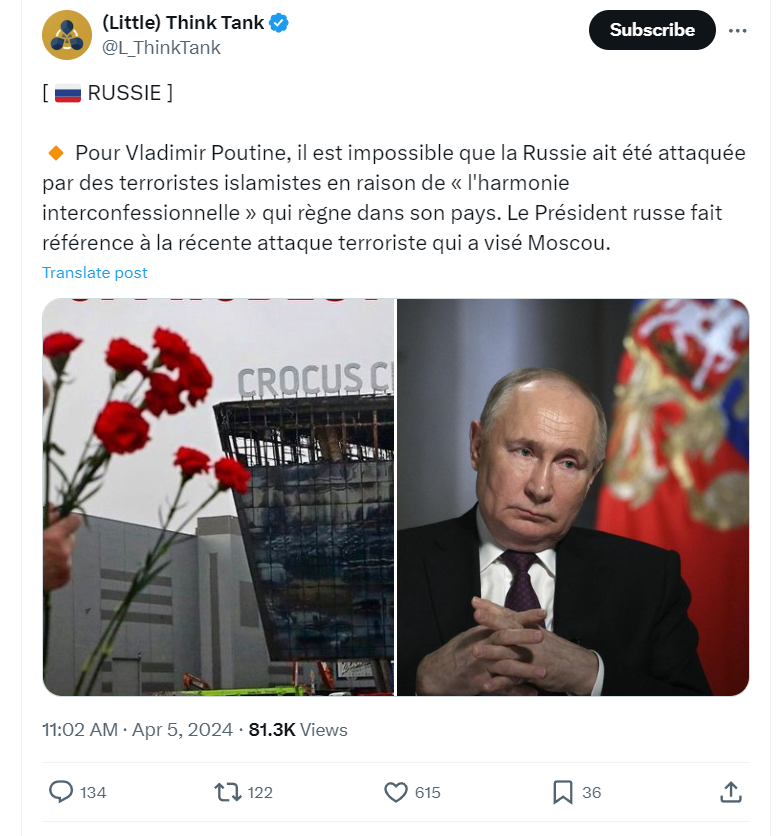 Poutine déclare qu'il est impossible que des islamistes radicaux aient décider eux meme de s'attaquer à la Russie car le pays est un exemple de coexistence pacifique entre différentes fois et différentes ethnies![]()