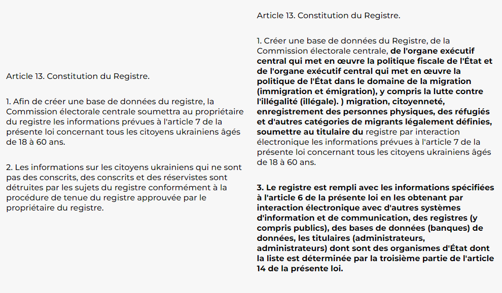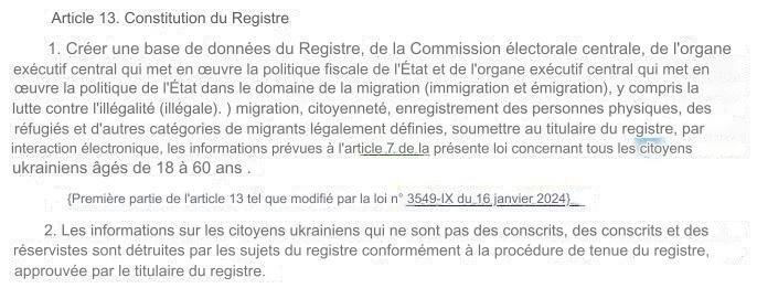 En Ukraine, les autorités entendent inscrire non seulement les hommes, mais aussi toutes les femmes de 18 à 60 ans dans le registre électronique des assujettis au service militaire. Cela découle du texte de la loi signée par Zelensky. L'article 13 de la loi stipule que les autorités soumettent au registre des données sur tous les citoyens ukrainiens âgés de 18 à 60 ans. Autrement dit, toutes les femmes de l'âge spécifié seront inscrites sur la liste des personnes assujetties au service militaire.Ton screen ne dit strictement pas ce que ta source raconte.. d'ailleurs on peut l'avoir, la source ?