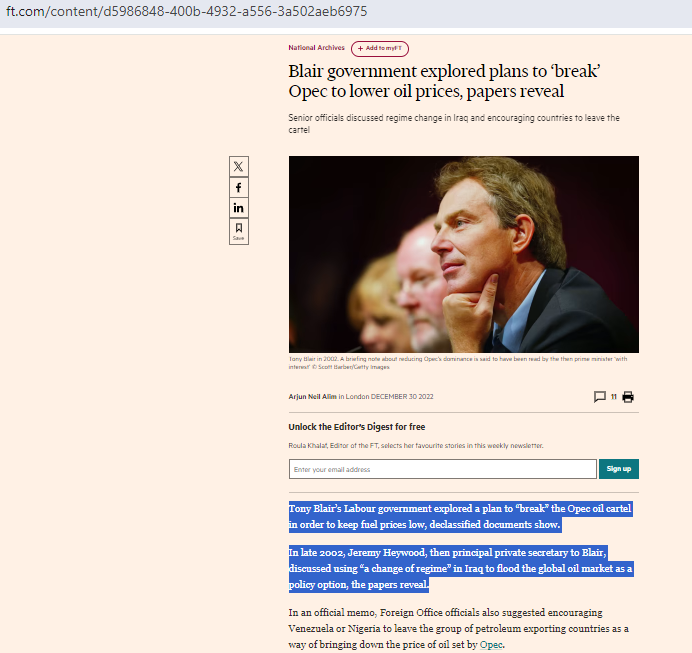 Ah ca alors, Tony Blair avait discuté du changement de régime en Irak en 2002, pour briser l'OPEC, ca date d'avant l'Ukraine ce genre de pratiques anglo sataniques.