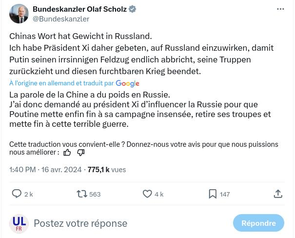 + En admettant que la Chine y aille bien, Xi fera bien en sorte que ça n'aboutisse pas à une "condamnation" trop ferme/massive de la Russie par le reste du monde. Xi veut que la Russie soit affaiblie, pas anéantie. Juste assez pour que Poutine continue à être un gentil toutou obéissant.