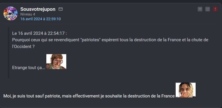 Par contre, je suis d'accord avec toi, il y a beaucoup de faux patriotes en France, le patriotisme est devenu un moyen d'autodéfense psychologique, les mecs se sont autopersuadés qu'être patriote ça va sauver ce shitole de pays qu'est la France
