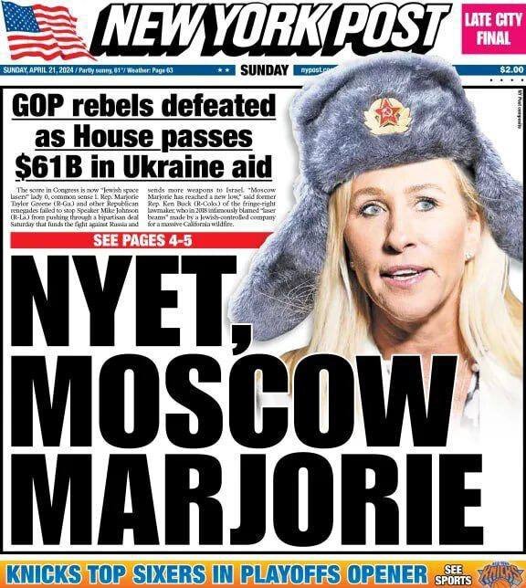 À tous les républicains qui viennent de nous huer, moi et mes collègues, sur le parquet de la Chambre pour les drapeaux de l'Ukraine, voici ma réponse : au diable Poutine et Slava Ukraini !
