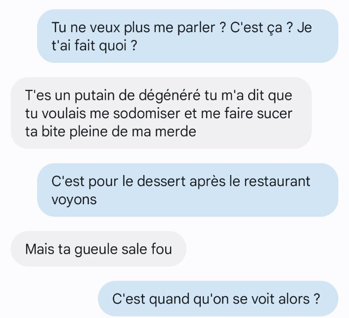 Le 29 février 2024 à 19:31:20 :Bah elle fait la dégoutée mais en attendant elle te bloque pas et continue même à te répondre