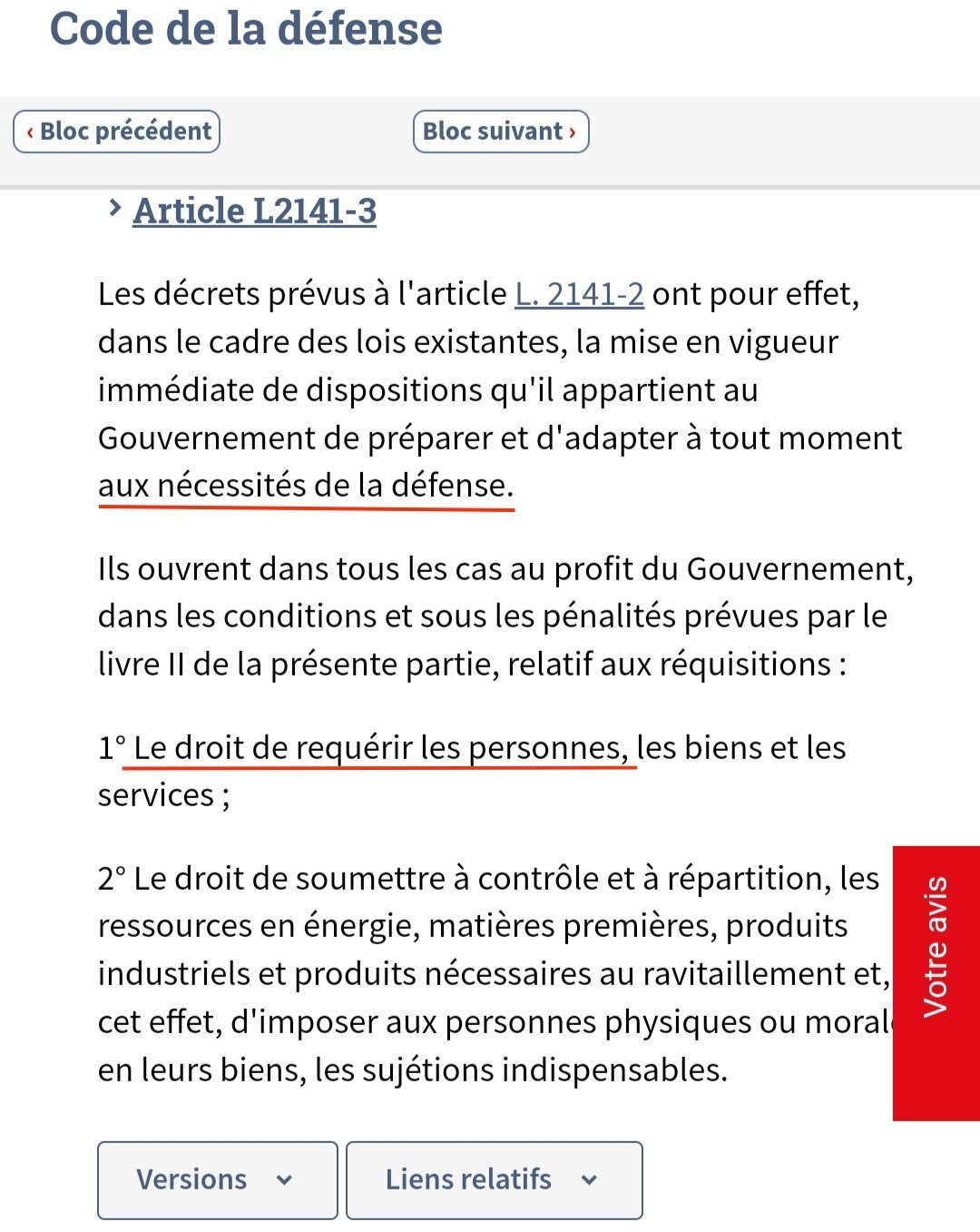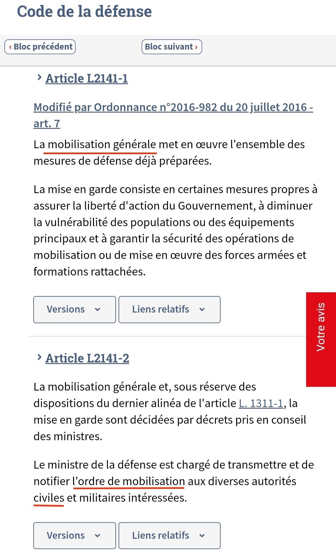 Ceux à qui ça s'intéresse, c'est toute la partie sur les régimes d'exception du code de la défense. On y trouve des infos intéressantes. Dont cette fameuse mobilisation générale.
