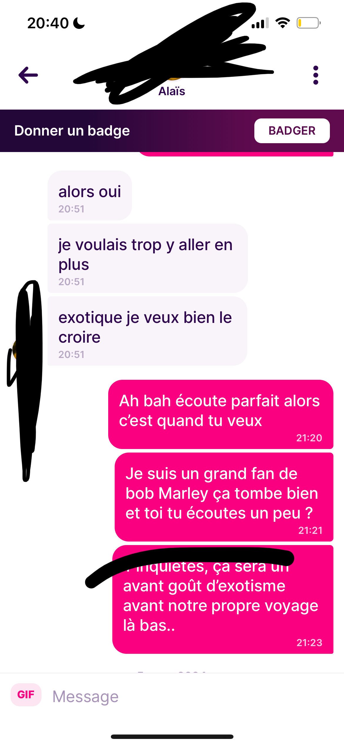 Moi si je fais ça je me retrouve en couple, je peux pas disparaitre... si c'était bien j'ai juste envie de continuer