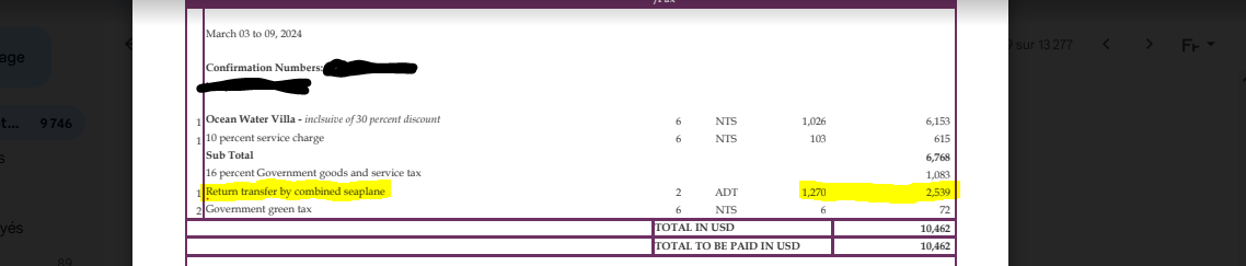 Par contre l'hôtel facture un vol un avion privé de 40mn obligatoire pour atteindre l'île , 2.5k pour 2 personnes