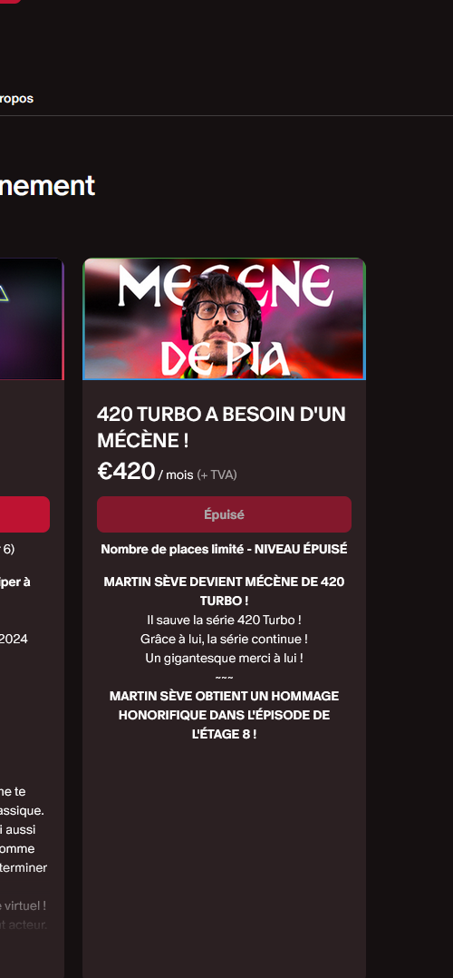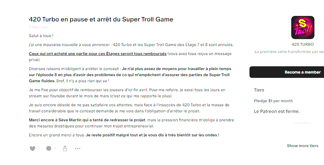 Ça y est, les 420 cette horreur qu'il ose appeler art, c'est fini, après un don de 420 euros d'un de ses golems de spectateurs. Il a donc une fois de plus menti et ne continuera pas les 420 en dépit de ce qu'il avait promis.