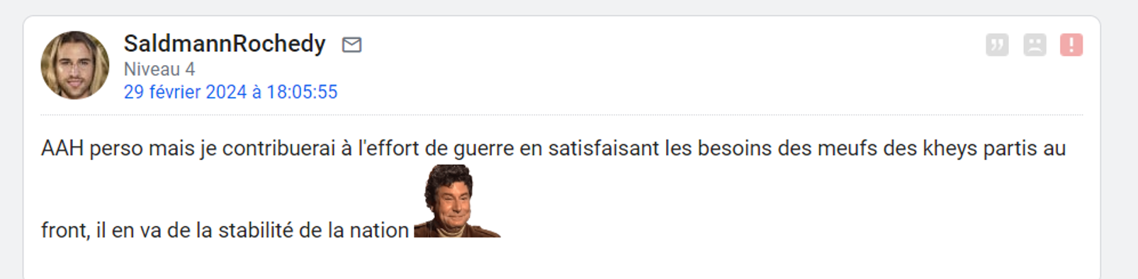 Le 10 mars 2024 à 15:31:16 : Il aurait du s'inventer une origine étrangère dès le départ pour éviter de se faire emmerder C'est ce que Giroud a fait quand il a eu les pro-benzema sur le cul