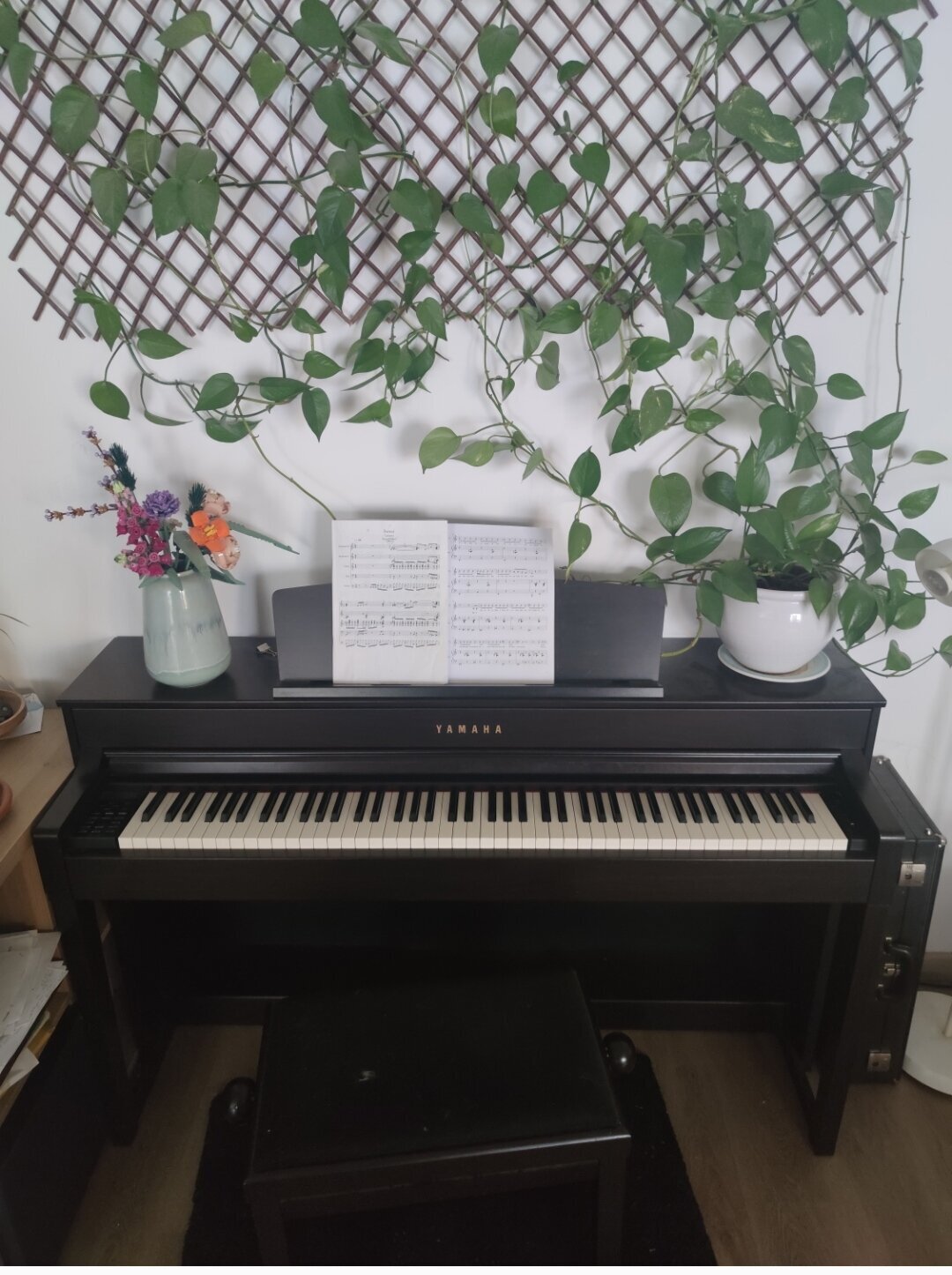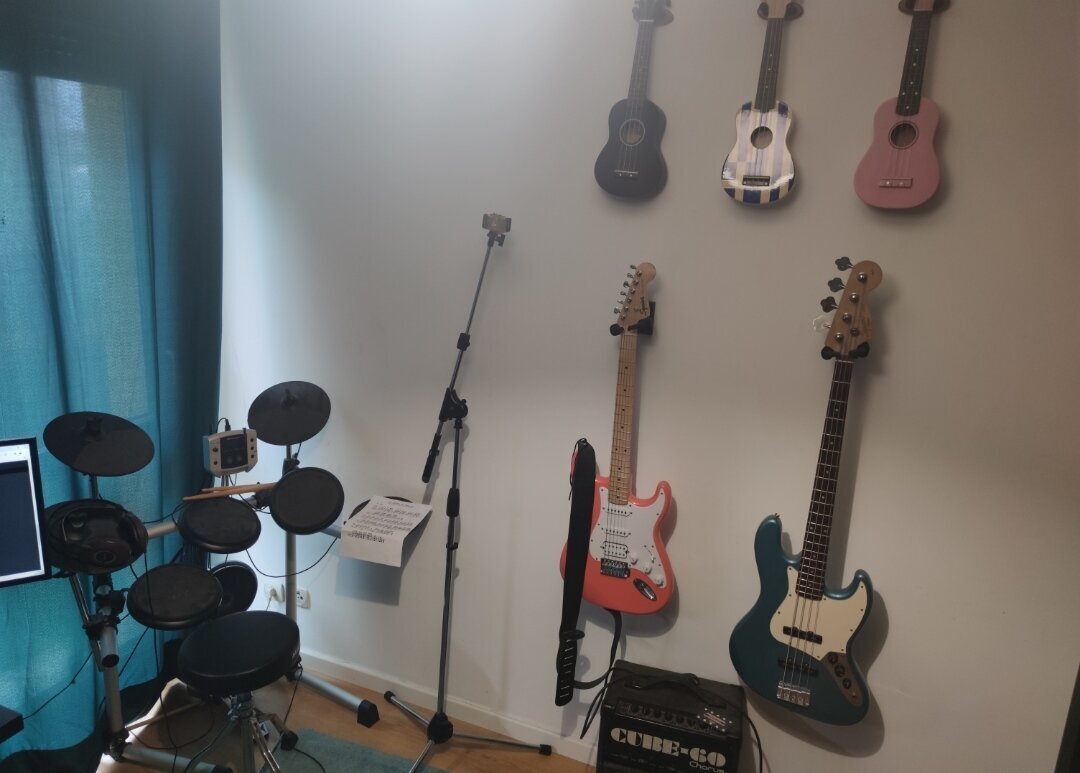 > J'habite dans un T3, donc j'ai toute une piece c'est mon bureau, c'est la ou j'ai tous mes instruments, tous mes timbres, ma petite collection de playmobil aussi