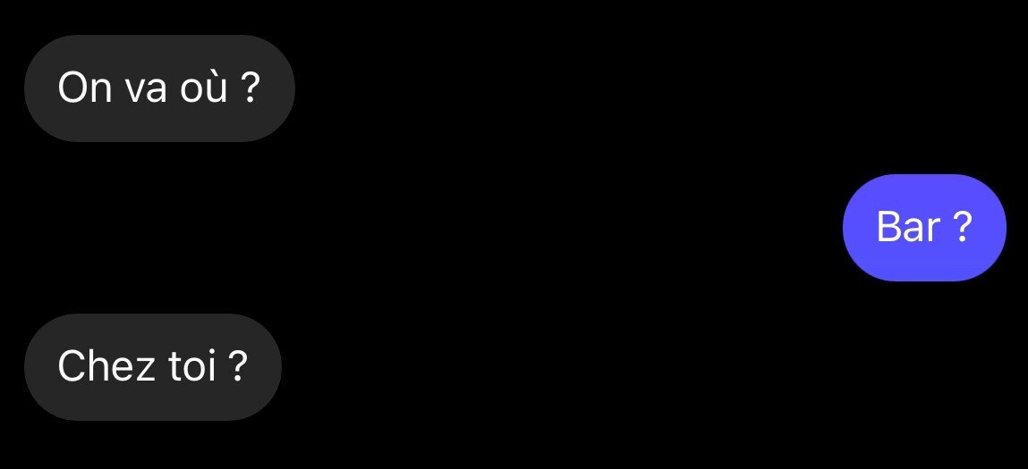 Tu te dis vas y go dans un endroit "safe" pour elle pour une rencontre etc donc tu proposes le traditionnel "bar".. La meuf : non direct chez toi(Elle sait ce qu'elle veut). Tu as de tout et son contraire