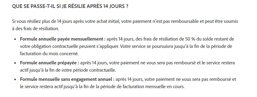 Putain j'ai pris une formule à 23€/mois pour Adobe Acrobat Pro juste le temps d'un mois. Et là j'apprends que pour résilier je dois payer 130 balles soit 50% de la formule annuelle.