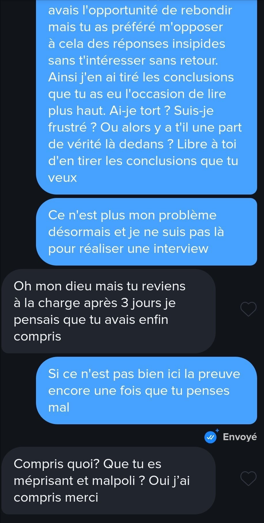 L’op ce détraqué lambda du forumLa meuf fait pas d’effort mais t’es une giga serpillère de continuer à lui parler
