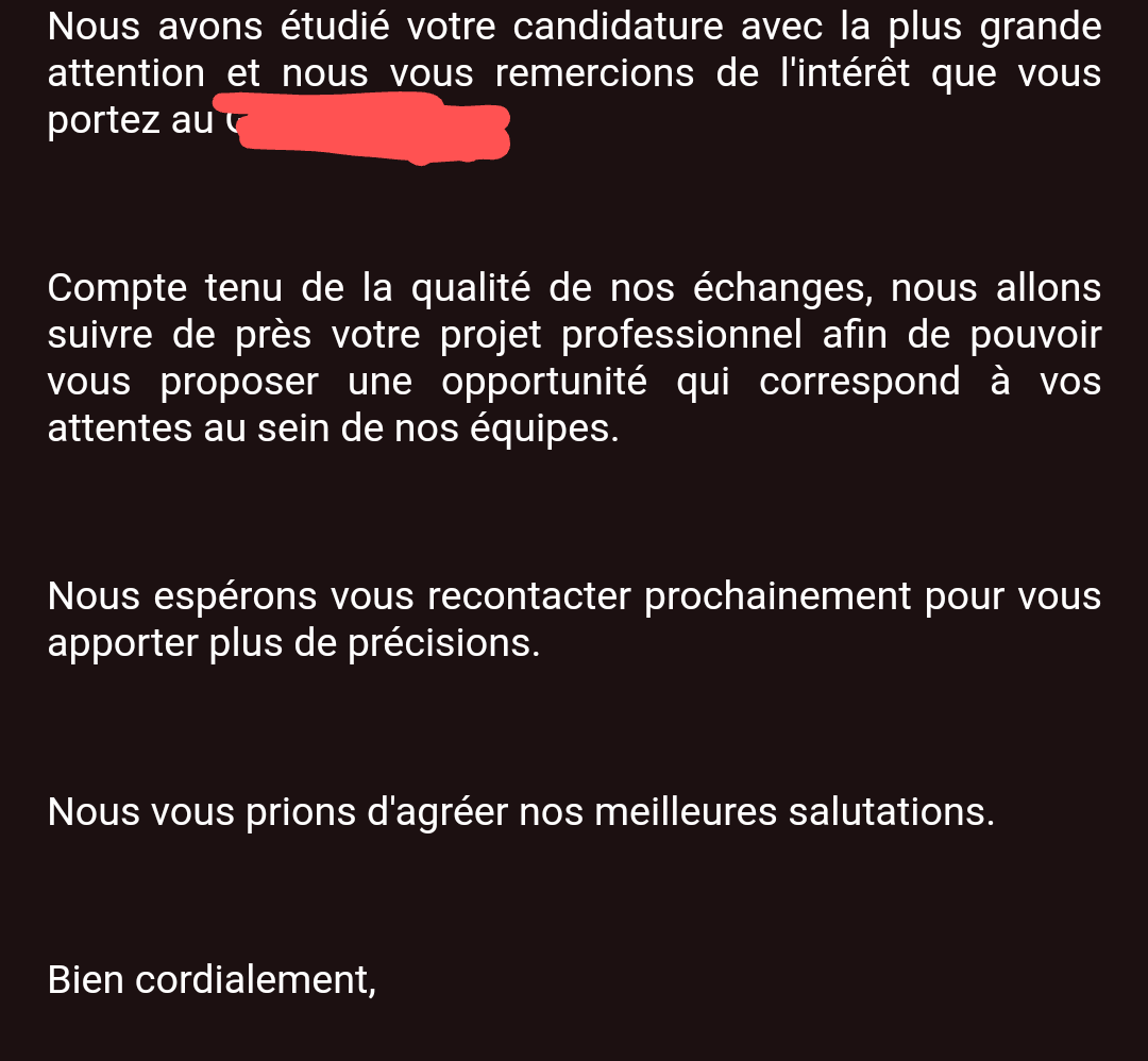 C'est positif ouiC'est pas un mail typique de "bon pas convaincu mais tqt on veut pas te démoraliser" ?