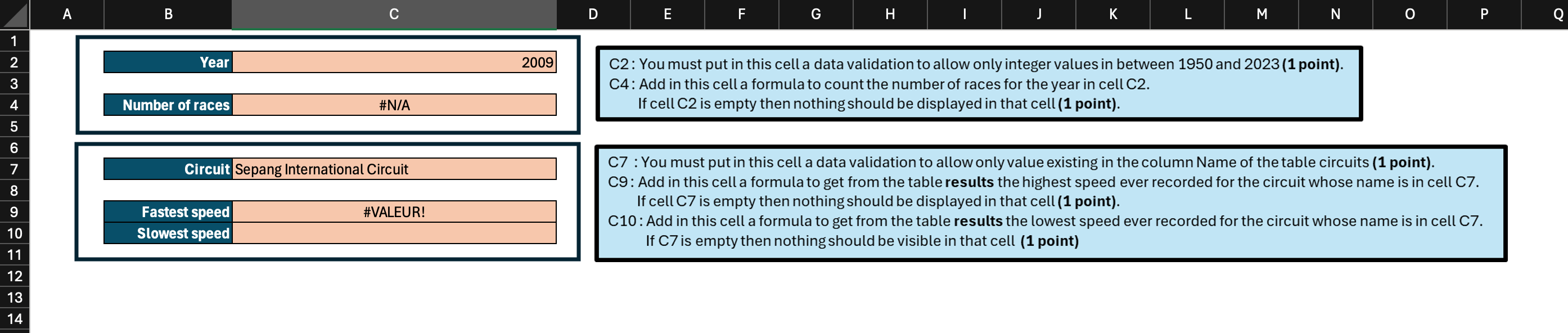 c2 : validation de cellules liste (data, data validation)c4 : countifc7 validation de cellules listec9 : maxc10 : min