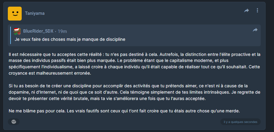 4 comptes bannis pour avoir dit à la mauvaise personne que si sa situation était merdique c'était de sa fauteLeur forum est un serveur discord de pote mais accessible au public en fait