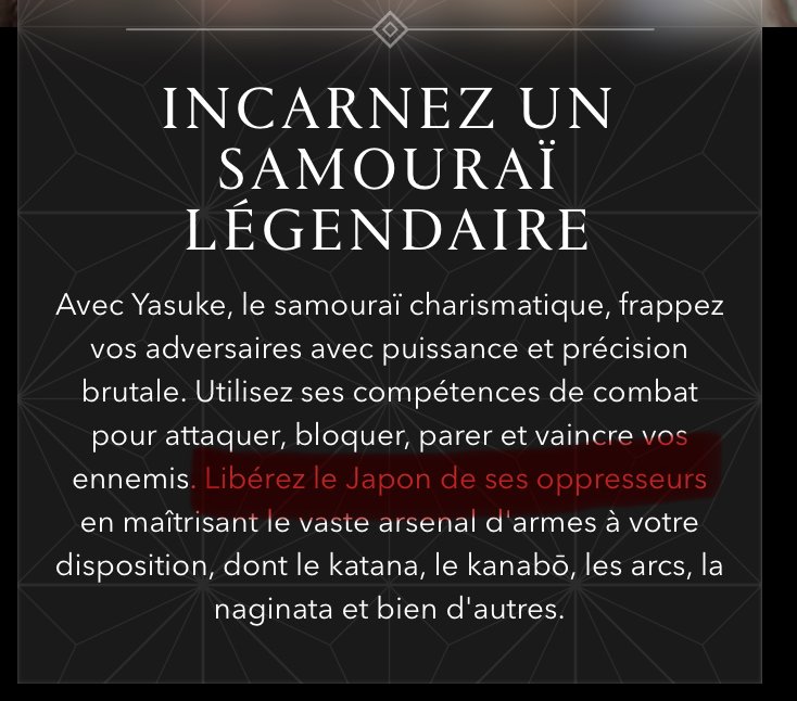 + prendre le seulrenoi de l'histoire du japon en 2000ans au lieu d'un putain de japonais comme dans tout les autre AC si tu vois pas le soucis c'est que t'as deja le cerveau grillévivement un AC au mali avec Jean jacque le breton ocmme perso principale