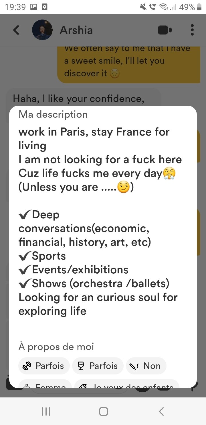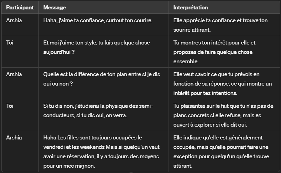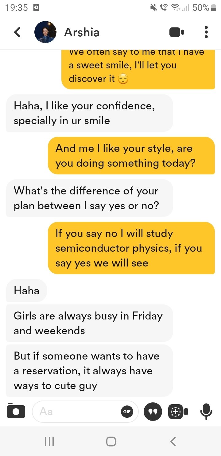 Arshia semble intéressée par toi, curieuse de tes intentions, et ouverte à l'idée de passer du temps ensemble si elle est convaincue que tu en vaux la peine. Continuer à être confiant et à utiliser l'humour tout en montrant un intérêt sincère pourrait bien fonctionner avec elle. En disant qu'elle est occupée les vendredis et weekends, elle te donne une information sur ses disponibilités tout en laissant entendre qu'elle pourrait faire une exception pour quelqu'un qui l'intéresse.