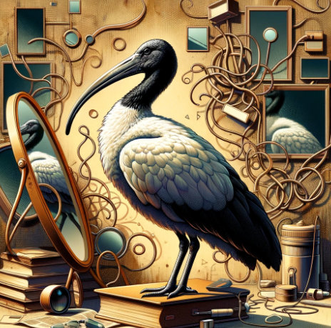 'Créature Totémique:' L'ibis, symbole de sagesse et de connaissance, qui scrute en profondeur les eaux de l'existence pour en extraire la vérité.