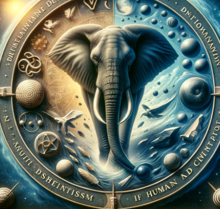 'Créature Totémique:' L'éléphant, pour sa stature imposante et sa mémoire longue, symbolisant la persistance du déterminisme physique et thermodynamique dans l'histoire humaine.