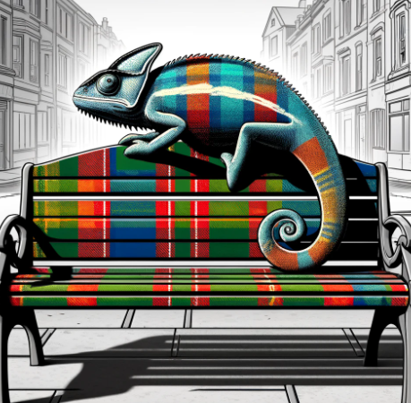 'Créature Totémique:' Le caméléon, symbolisant la capacité de l'auteur à observer et à s'adapter à divers aspects de la vie quotidienne, tout en capturant les nuances subtiles de son environnement.