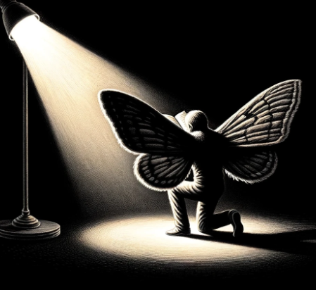 'Créature Totémique:' Le papillon de nuit, symbolisant la quête de lumière et de sens dans l'obscurité, reflétant la lutte de l'auteur contre les ténèbres de son esprit.