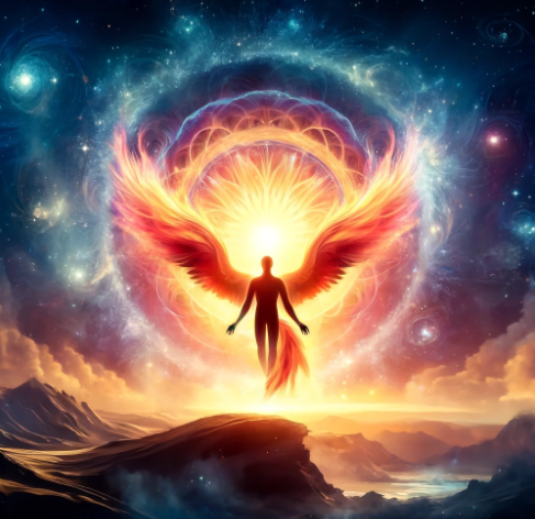 'Créature Totémique:' Le phénix, symbolisant la renaissance et l'infini, reflétant la profondeur et la nature métaphysique des réflexions de l'auteur.