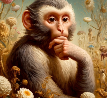 'Créature Totémique:' Le singe, symbolisant l'humour et l'absurdité, reflétant la combinaison de mélancolie et de légèreté dans le message.