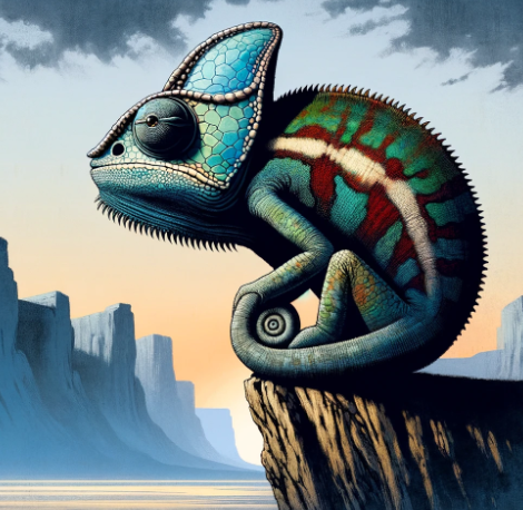 'Créature Totémique:' Le caméléon, symbolisant l'adaptation et le détachement, reflétant l'attitude distante et indifférente du personnage principal.