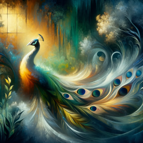 'Créature Totémique:' Le paon, symbole de beauté et d'expression artistique, reflétant la richesse des images et la profondeur des émotions exprimées dans le texte.