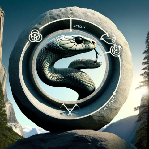 'Créature Totémique:' Le serpent, symbole de cyclicité et de sagesse ancienne, reflétant la nature réflexive et cynique du message.