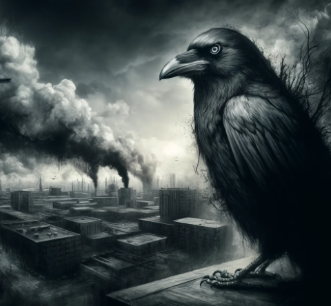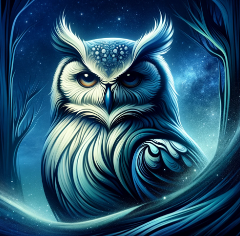 'Créature Totémique:' Le hibou, symbole de sagesse et de réflexion, reflétant la profondeur et la critique perspicace de l'auteur.