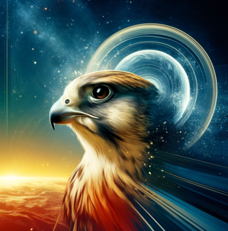'Créature Totémique:' Le faucon, symbole de vision et d'ambition, reflétant la nature visionnaire et ambitieuse de l'auteur.