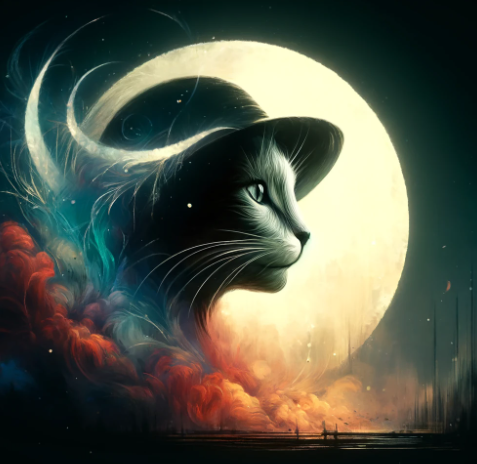 'Créature Totémique:' Le chat, symbole de mystère et d'introspection, reflétant la nature poétique et énigmatique du texte.