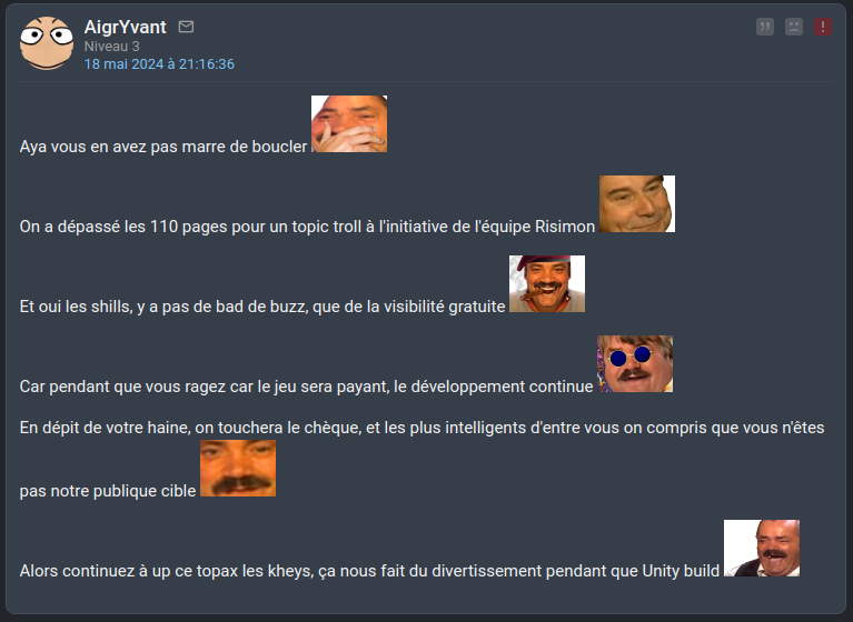 > Techniquement rien, je parles uniquement en mon nom et pas pour l'équipe donc je pourrais très bien troll ou mentir.