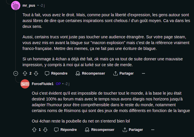 + ils ont aussi essayee de faire de la pub sur reddit et se sont fait lyncher là bas aussi ahi : https://www.reddit.com/r/jeuxvideo/s/iHLBmaBxX1Les développeurs Risimon sur ce topic : " Ce jeu n'est pas pour le forum et ne rendra pas hommage au forum "
