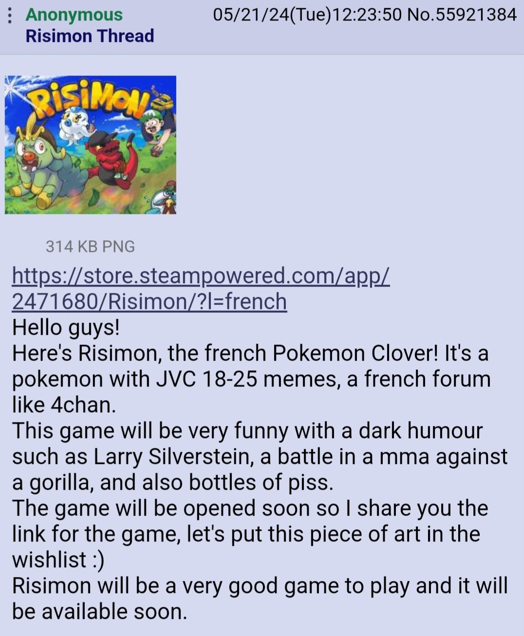 + ils ont aussi essayee de faire de la pub sur reddit et se sont fait lyncher là bas aussi ahi : https://www.reddit.com/r/jeuxvideo/s/iHLBmaBxX1Les développeurs Risimon sur ce topic : " Ce jeu n'est pas pour le forum et ne rendra pas hommage au forum "