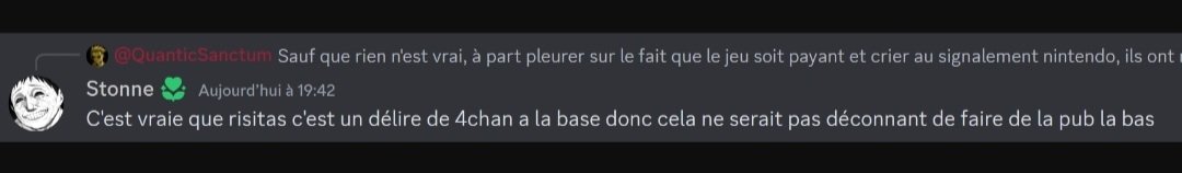 + ils ont aussi essayee de faire de la pub sur reddit et se sont fait lyncher là bas aussi ahi : https://www.reddit.com/r/jeuxvideo/s/iHLBmaBxX1En vérité, les mecs du Discord, j'espère pas de vous plomber dans mon cas, je m'en fous du drama, mais d'un consommateur à un autre :