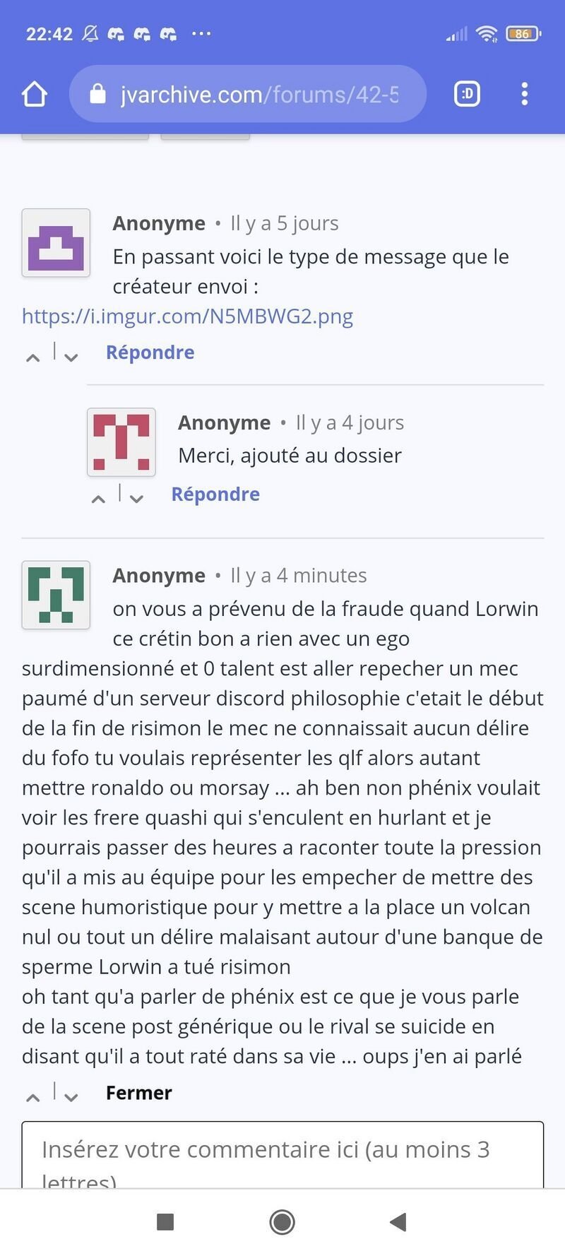 Ya un modo sur GDC qui insta supprime le post suivant (3 tentatives aujourd'hui depuis cet après midi, toutes supprimées dans les 2min max).C'est flippant de se dire qu'un type surveille et protège ce topic toute la journée