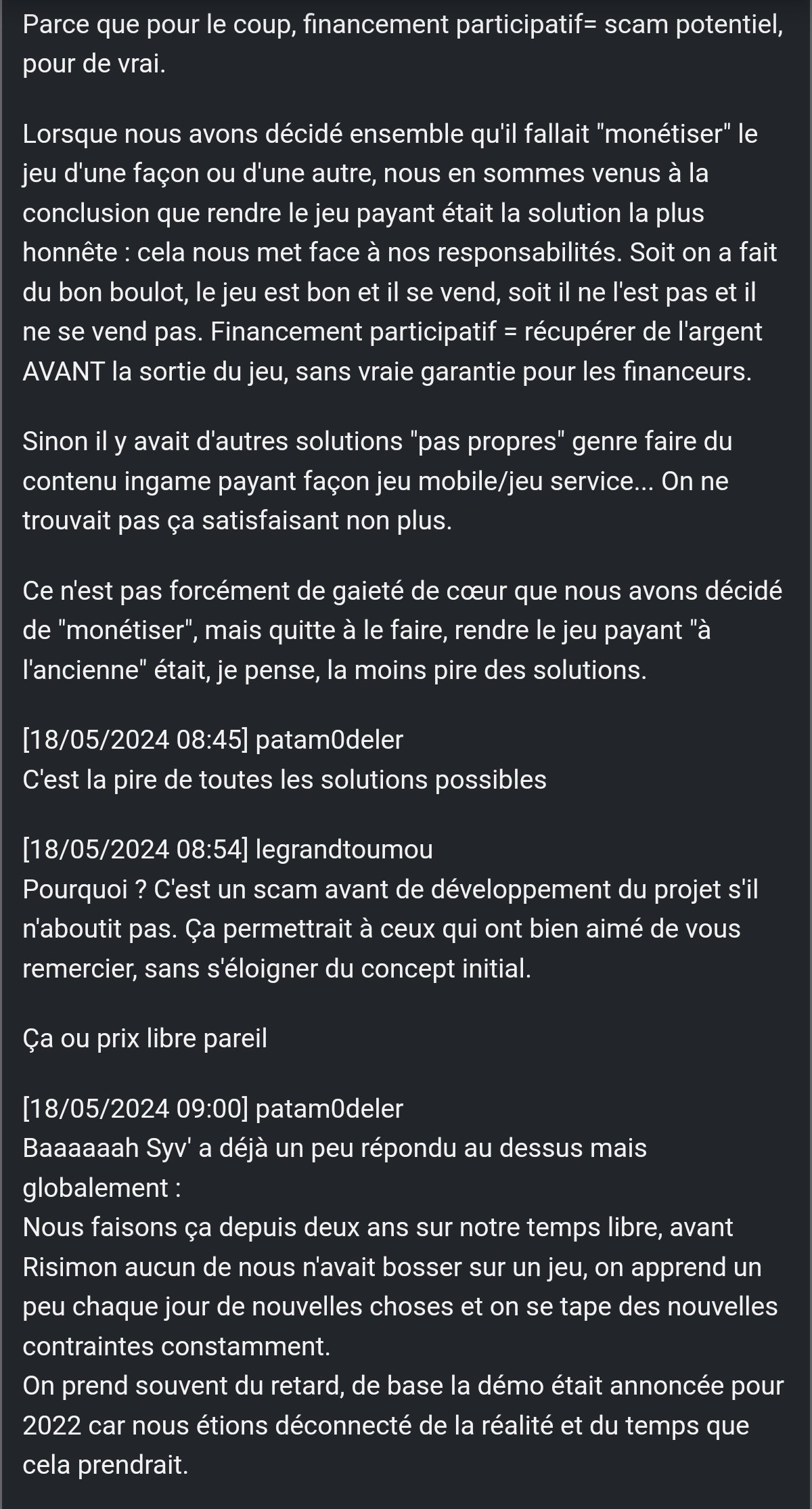 Que je veux te montrer, c'est que des projets sains y'en a, mais quand y'a zéro support de la part d'une comu en particulier, même si tu l'apprécie, tu finis pas t'en détourner au profits d'autre comu (Ou tu te fou de leur gueule en leur facturant un produit imaginé et créer en partie par la comu elle même)