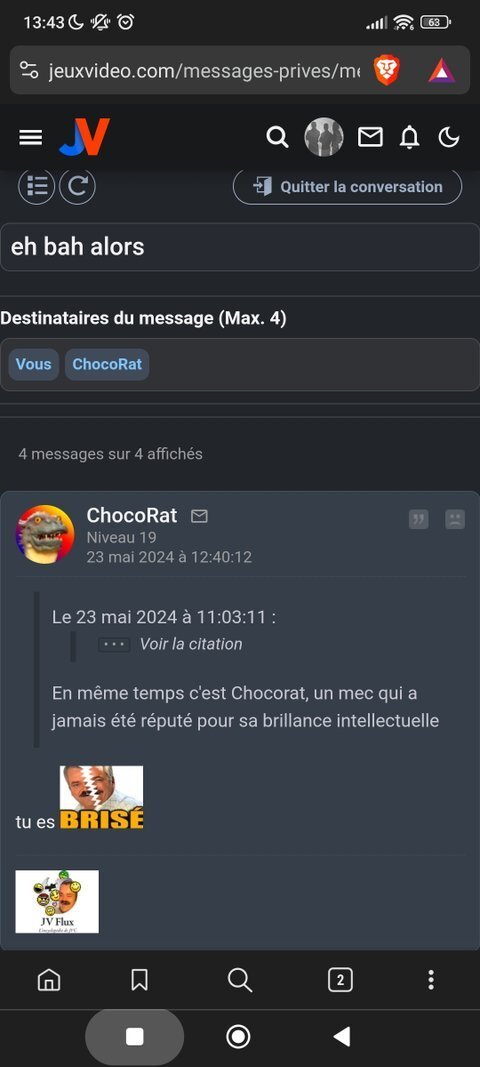 Après j'avoue, ma provocation d'origine était complètement gratuite, c'est juste que j'ai vu plusieurs fois le screen où Chocorat agaissait comme un connard avec Force-Fluide en le prenant de haut, et j'ai saisi l'occasion de m'en prendre à lui, comme une punition karmique