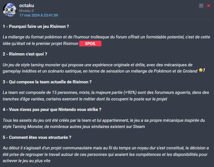 Et pour ceux qui disent "3 ans de travail ça le mérite" alors bon déjà il faut voir le résultat mais même si le jeu est bon bah ça a change rien. Déjà comme expliqué une bonne partie des kheys qui ont travaillé dessus se feront baiser car ils recevront pas leurs part+ils devront en plus payer pour pouvoir jouer au jeu. Et ensuite c'est un fangame en fait (vous pouvez le nier ça ne changera pas les faits) normalement tu le fais pas pour l'argent mais pour le plaisir fallait vous attendre à galérer et que ça prend du temps si vous êtes pas capable d'assumer bah c'est pas notre problèmeSi t'es pas capable de supposer qu'on a utilisé que du contenu créé par la team c'est pas notre problème, on va pas soigner tous les low du fofo