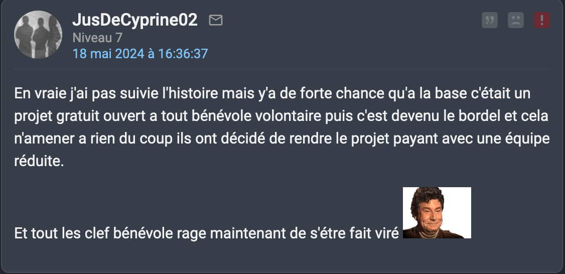 En vraie j'ai pas suivie l'histoire mais y'a de forte chance qu'a la base c'était un projet gratuit ouvert a tout bénévole volontaire puis c'est devenu le bordel et cela n'amener a rien du coup ils ont décidé de rendre le projet payant avec une équipe réduite.Et tout les clef bénévole rage maintenant de s'étre fait viré