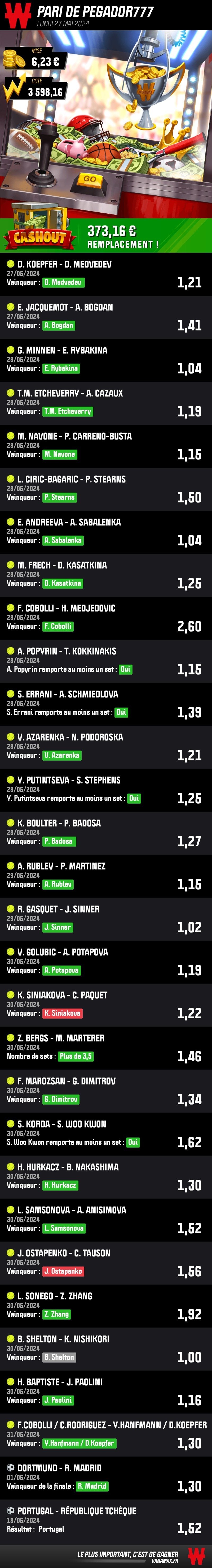 Déjà failli gagner 5k il y a quelques mois comme ça sur le foot ça m'a brisax, la mise était 80€ouais mais entre 5k et 58k voire 300k c'est la meme chose pelo
